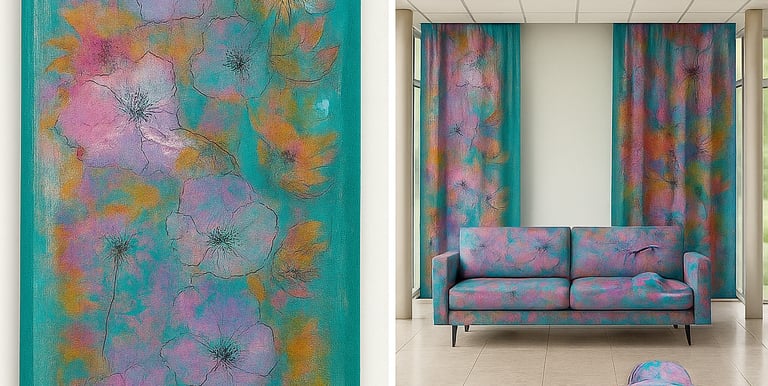 Taiteellinen alkuidea (maalaus) voidaan muuntaa designiksi eri materiaaleihin: